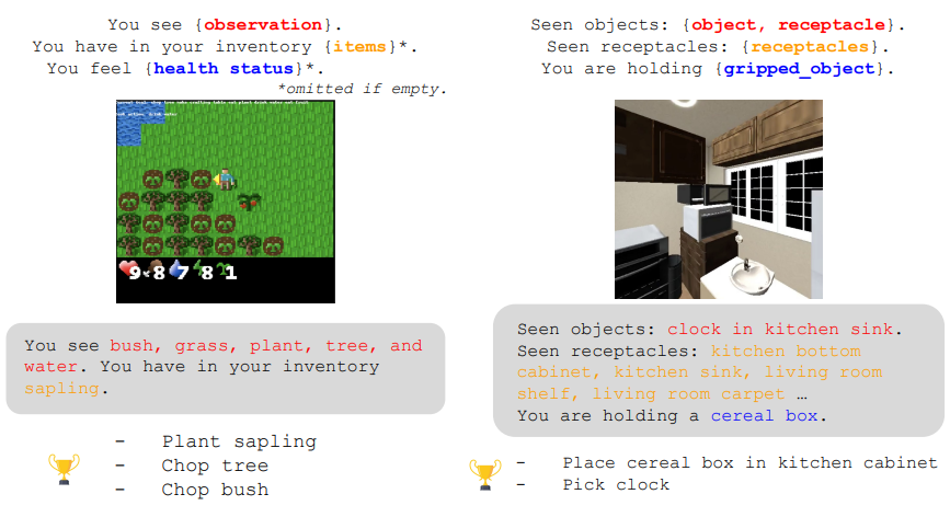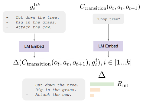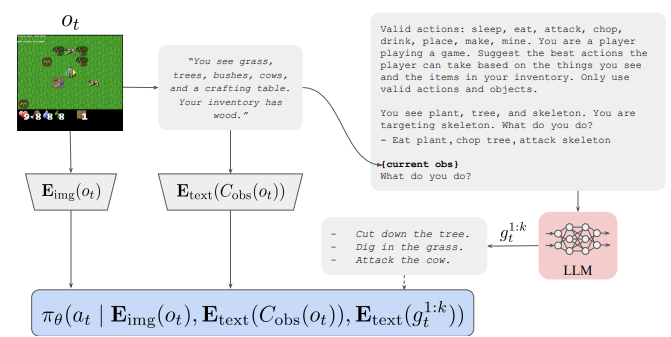사람은 게임을 할 때 가능한 모든 경우를 시도해보지 않고도 문은 열쇠를 통해 열고 사다리는 타고 오를때 사용하며 뱀은 몬스터일 수 있다는 것을 일반적 상식으로 안다. ELLM은 RL 모델이 이러한 배경지식을 가지도록 의도한 방법론인 것이다.
