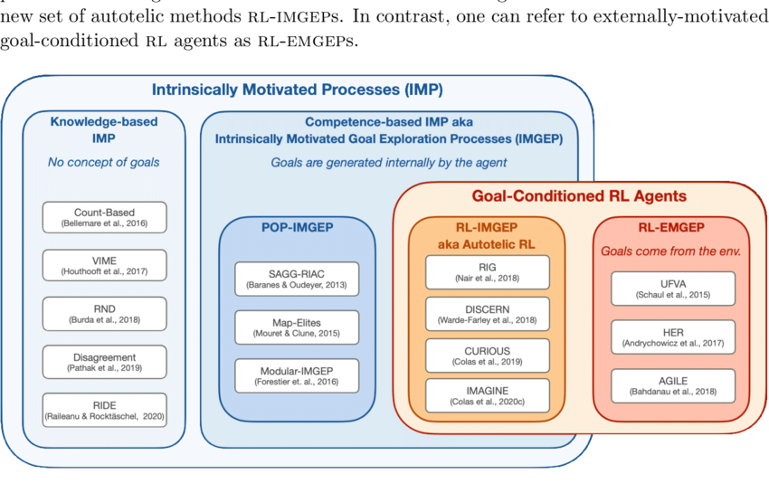 IM RL모델은 크게 지식 기반 IM(KB-IM)과 Competence 기반 IM(CB-IM)으로 나뉜다. KB-IM은 상황의 다양성을 극대화하는 것에 중점을 두고 CB-IM은 에이전트가 마스터하는 스킬에 중점을 둔다. ELLM은 에이전트가 일반적 상식을 기준으로 효과가 있을 것 같은 스킬 중에서 액션을 탐색한다는 점에서 CB-IM방법에 속한다고 할 수 있다.