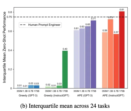 자동 프롬프트 엔지니어(APE)는 기계가 프롬프트 후보값을 자동으로 생성하고 이 중 최적의 선택값을 선택하는 알고리즘이다. APE는 Instruct GPT 모델 기준에서 기존사람이 처리하던 프롬프트 학습방법을 능가하는 성능을 보여주었다.